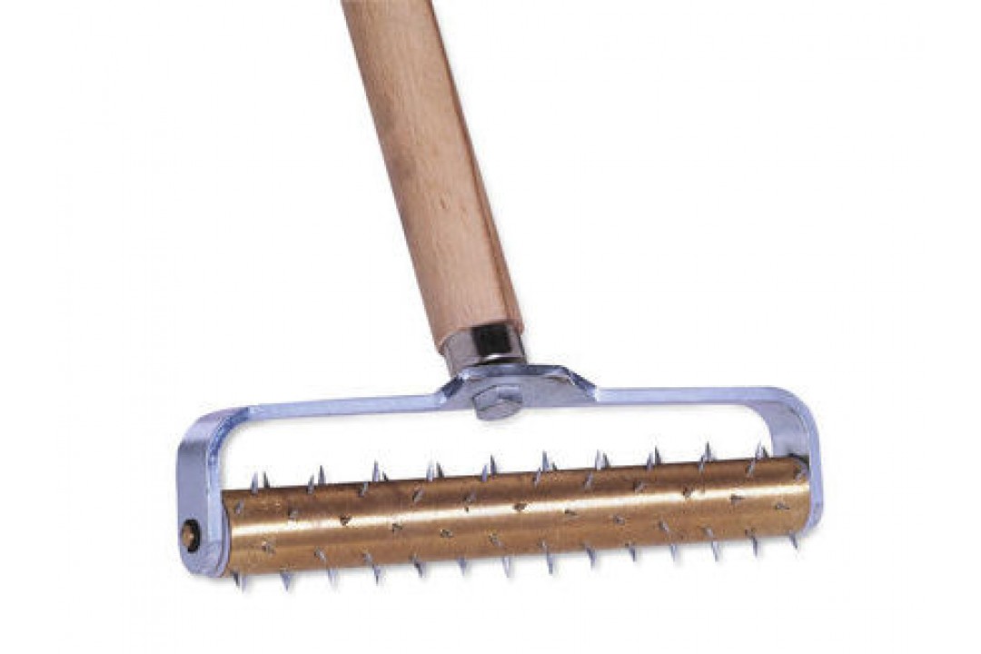 Используется, когда нужно изменить форму гипсокартонного листа. Такой вид работ проводится при создании арок из гипсокартона, конструкций, имеющих круглую форму. Валик игольчатый для гипсокартона состоит из ролика с металлическими иглами, металлической скобы -держателя, на которой закреплен ролик, и деревянной ручки. Лист гипсокартона разрезают на детали, затем места будущего сгиба смачивают водой. Иглами валика прокалывают поверхность сгиба, продвигая его по поверхности. Деталь гипсокартонного листа сгибается и фиксируется в определенной для конструкции форме. Деревянная ручка инструмента удобной формы и длины. Валик с иглами значительно облегчает труд при создании конструкций из гипсокартона.